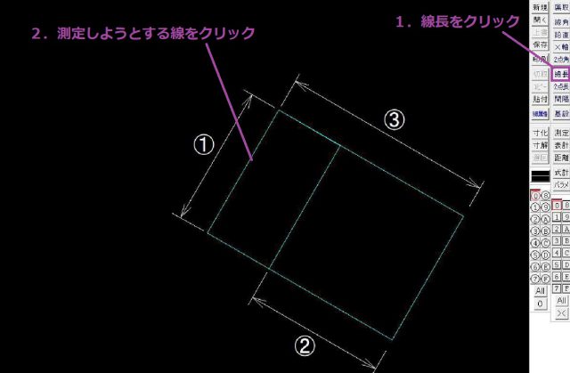 まずは線の測定をできる状態にするために「線長」をクリックします。その後、線の長さを測定しようとする対象の線をクリックします。