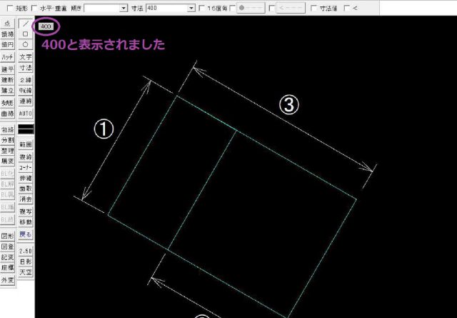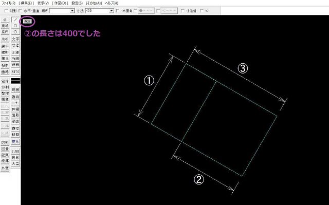 測定した①の線長が400であることが判りました。次に②の線長を測定してみます。ただ、この線を「線長」コマンドで測定すると線まるごと測定してしまうため正しく②の長さが測定出来ません。