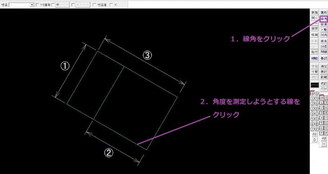 線の長さを測定できたように、その線の角度を測定することも可能です。②の角度を測定してみます。やり方は長さ測定と同様に、まずは「線角」をクリックして、測定したい線をクリックすればOKです。
