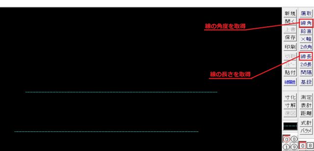 先述では線そのものの属性取得を行いました。他にも線の長さと角度を取り込むことが可能です。ツールバーよりそれぞれ「線角」、「線長」をクリックすれば線の角度と長さを取得出来る状態となります。