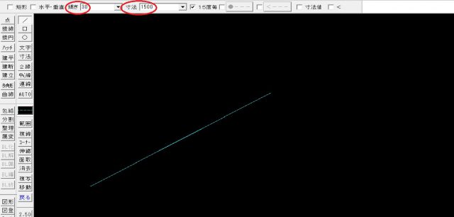 線の角度は30度、線の長さは1500という事がわかりました。わかったのと同時に、これはすでにその値を取り込んでいますので、この状態で線を引けば自ずと取得元と同じ線が引けるという事です。ちなみにこちらもクロックメニューに対応していますので覚えておくと便利です。