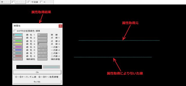 この状態で線を引くと、属性取得元と同じ線を引くことが出来ます。