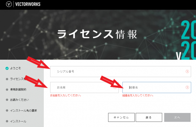 次のページで、シリアル番号と名前を入力します。シリアル番号は、メールで送られてきた番号を入力します。