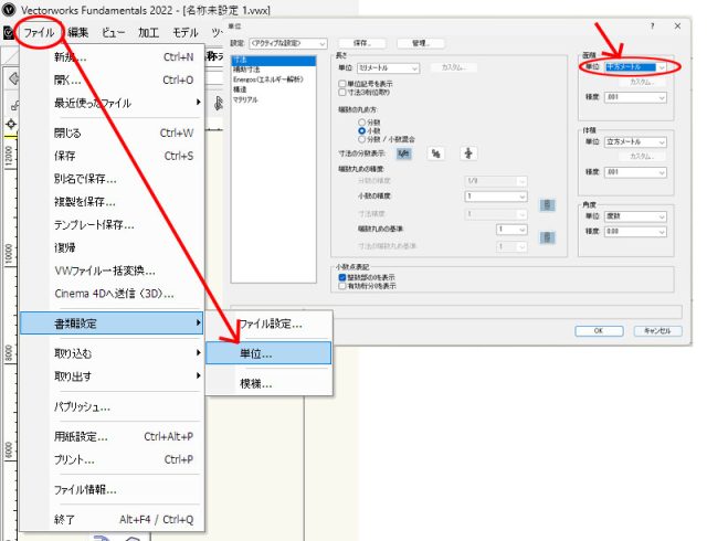 メニューバーから「ファイル」→「書類設定」→「単位」