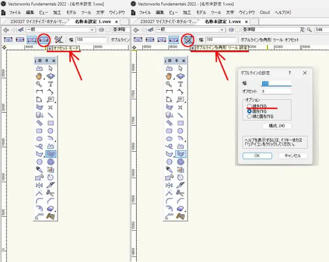 基本ツール内のダブルライン多角形ツールをクリックして画面上にカーソルを持っていく、多角形ツールと同様にクリックした点が頂点となる、ダブルラインの多角形ができます。壁を作図する際などによく使用します、その際に中心の芯にスナップしてを壁を作図したり、任意の数値芯からずらして作図する事もオフセットモードを使う事で可能です。また、ダブルライン多角形を多角形ではなく線として作成する事も可能です、こちらもメニューバーより設定を開きオプションメニューから「線を作る」を選択する事でダブルラインの形状となります。