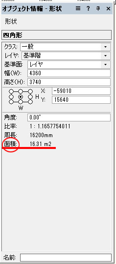 面積を求めたいオブジェクトを選択すると、データパレット中に面積が表示されています。
