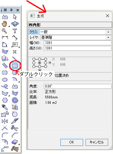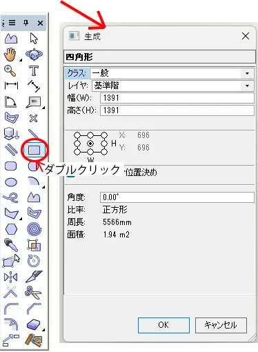また、四角形ツールをダブルクリックすると四角形の生成ダイアログが出ます、ここからサイズ指定の四角形を作成し作図する事も可能です。