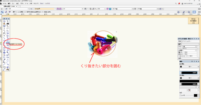 基本ツール内からくりぬきたいデザインを指定できるコマンドを選びます、今回は楕円を使ってくり抜いてみます。表示したい部分を囲みます。