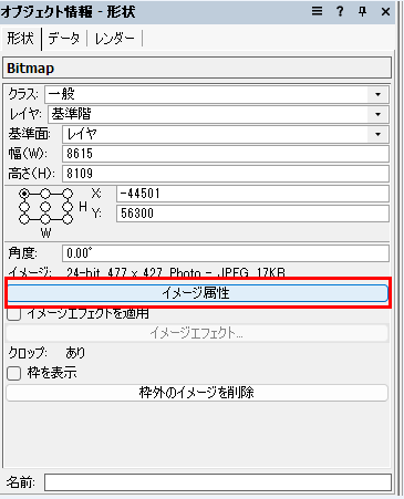 今度は取り込んだ画像の色をなくして、モノクロの画像にする仕方です、指示図や注意点を浮き立たせる為に、あえてモノクロにする場合などに使えます。イメージ属性のポップアップを表示します。