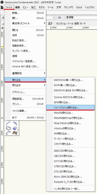 まずは、作図画面に画像を取り込んでみましょう。メニューバーから「ファイル」→「取り込む」→「イメージファイルの取り込み」をクリックします。