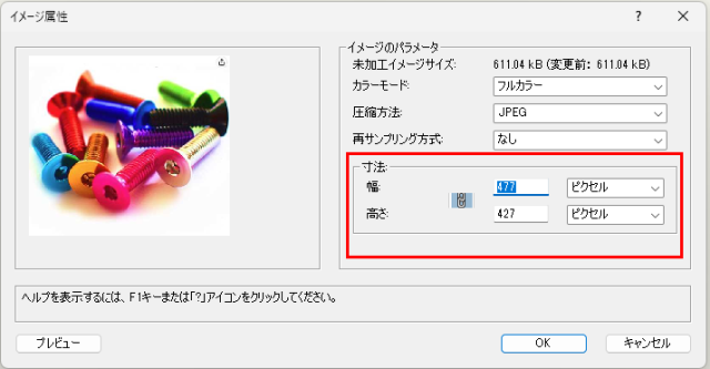 選択した画像の、イメージ属性のポップアップが表示されます。