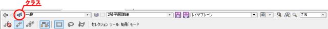 まずはクラスの考え方を理解しておきましょう、レイヤと混同してしまいがちですが、クラスは、レイヤの情報をさらに階層化して種類別に分けて管理する事ができる機能となります。例えば、レイヤにて建物の階数を分ける「1階」「2階」「3階」etc. そしてクラスにて内部の造作に関する種類を分ける「通り芯」「柱・壁」「建具」etc. というように、紙を重ねて管理するレイヤに対して、種類で管理するのが、クラスとなります。クラスを設定する事で、異なるレイヤにまたがる図形を種類(クラス)別に選択する事が可能になります。