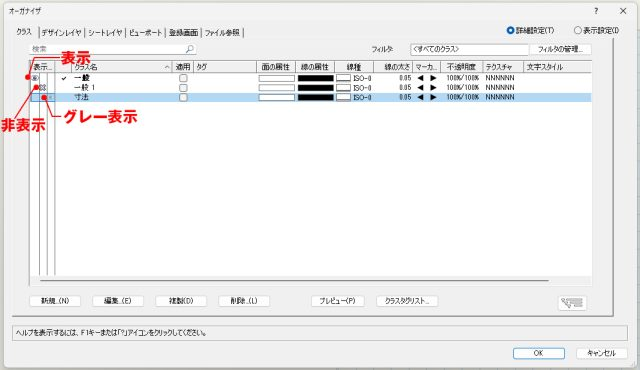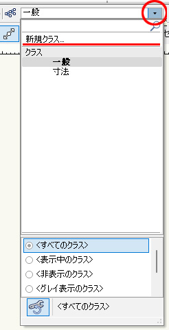 レイヤと同様にクラスも、アクティブレイヤー以外の表示方法が選択できます、設定の仕方は2通りあります。