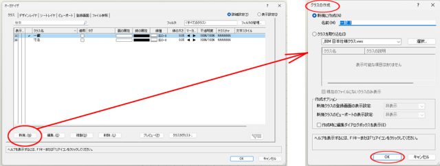 「新規(N)」をクリックすると、「クラスの作成」の画面が開きます、ここで新規のクラスの名称を書き込み「OK」をクリックすると新規のクラスが作成されます。
