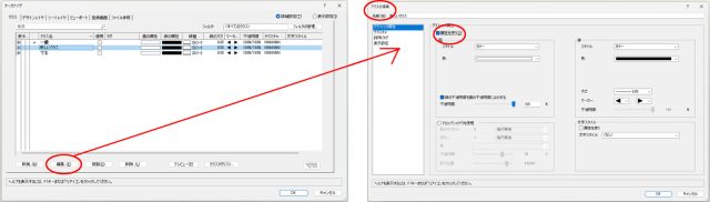 ここでは、面・線の色や、線の太さや不透明度等々を設定する事ができます。ここで設定した内容が、このクラス内の図形全てに反映されます。基準線や、柱や壁などの、一定の属性が見込まれるクラスに対して設定を行っておくと、作図する上で効率的です。ただし、「属性を使う(U)」に✓が入っていないと属性内容を編集しても図面に反映されないので、属性を反映させたいクラスには、必ず✓をいれて下さい。