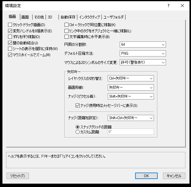 描画では、上記のようなマウスの動作の意味を設定します。マウスのスクロールでズームするのが邪魔な場合は、ここでチェックマークを外せばその動作はなくなります。