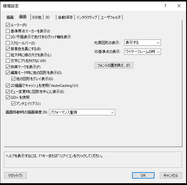 2. 環境設定で、Vectorworksの基本的なソフトウェアの設定ができます。特に重要なのが、描画・画面・その他・自動保存です。