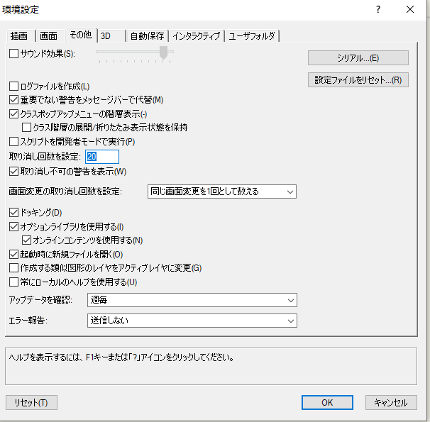 その他の中で特に注意して欲しいのが、取り消し回数です。Vectorworksは、取り消し回数をたくさん設定することができますが、その分パソコン内のCacheが増えることを脳内に入れて設定しましょう。