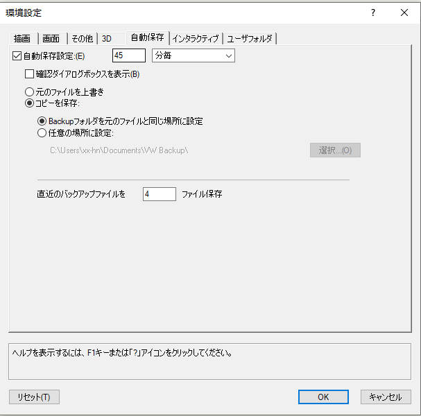 自動保存では、自動保存をいつするかという設定ができます。自動保存を設定しておくと、もしもの場合(落雷などでパソコンの電源が落ちるなど)にファイルをすべて失う可能性を減らしてくれます。