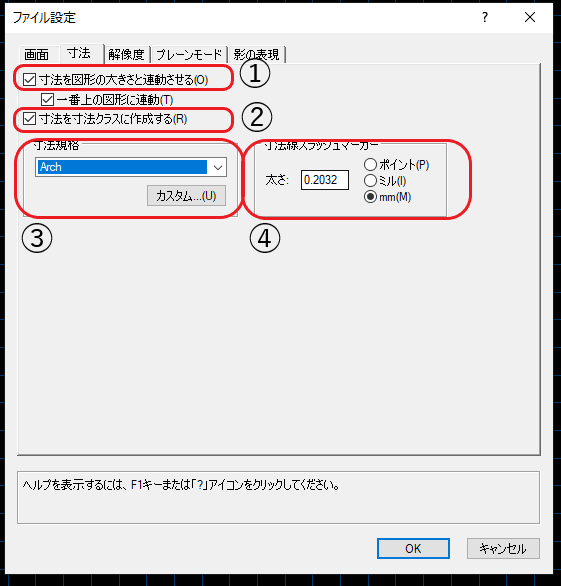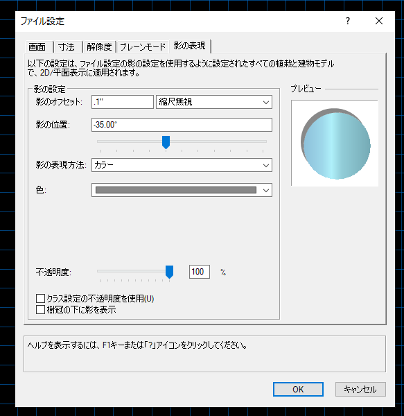 寸法設定のほかにも、レンダリングする際に変化がでる解像度設定、どの角度から図面または3Dモデルを見るか設定するプレーンモード、影の濃さを調節する影の表現などの設定もファイル設定からできます。設定が終わったら、『OK』を押して設定完了です。