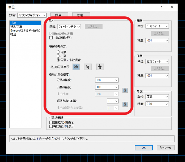 上の画面が出てきたら、寸法から長さの設定をします。単位は、お使いの単位を選択してください(上図の場合、フィートインチ)。端数丸めの設定も、この画面で設定できます。より精密な図面を作成したい場合、少数の精度の単位を変更してください。単位設定では、寸法だけでなく、エネルギー解析(電力など)や構造の設定もできます。また、ファイルごとに寸法単位が変わる場合、この設定画面で変更可能です。