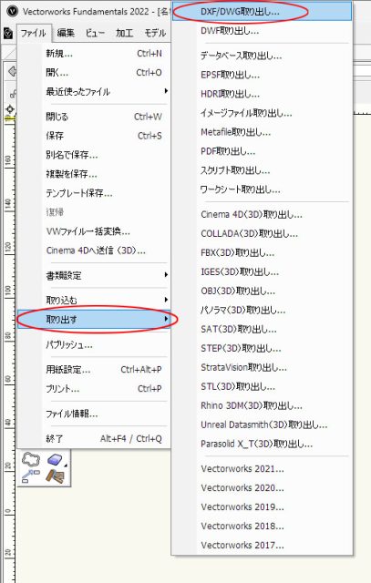 メニューバーの「ファイル」から「取り出す」「DXF/DWG取り出し」をクリックします。