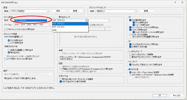 「DXF/DWG取り出し」のダイアログが開きます。