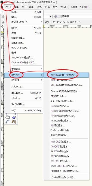 今度はDXFデータをベクターワークスで取り込む方法を確認しましょう。メニューバーの「ファイル」→「取り込む」→「DXF/DWG単一 取り込み」をクリック。