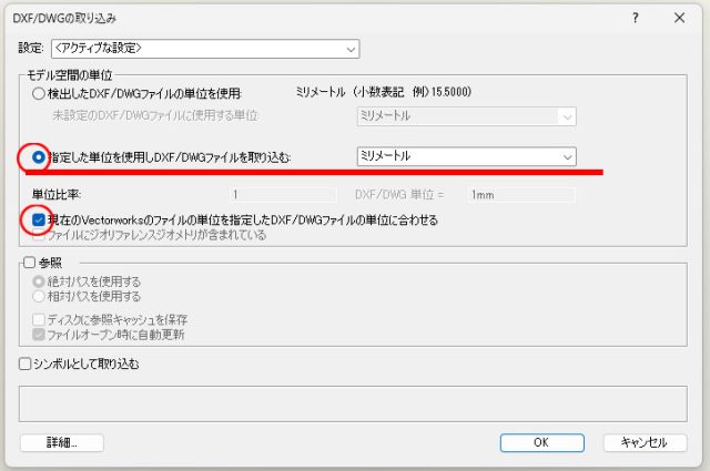 ファイル選択のダイアログが表示されますので任意のファイルを選択します。次のダイアログで必要個所の設定を行いますが、ここでは図面を変換する上で特に重要な所を確認します。「モデル空間の単位」この部分はデフォルトでは「検出したDXF/DWGファイルの単位を使用」になっていますが、このままだと元々の単位の設定が変わってしまう可能性がある為、「指定した単位を使用しDXF/DWGファイルを取り込む」にチェックを入れ「ミリメートル」で取り込みを行います。「単位比率」この部分は「現在のVectorworksのファイルの単位を指定したDXF/DWGファイルの単位に合わせる」にチェックを入れます。「OK」をクリックで取り込みが完了します。