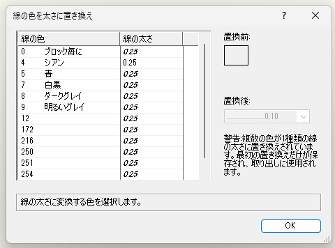ベクターワークス以外の図面の場合、線の太さを色で管理している為、「線の色を太さに置き換え」の作業が発生します、先方の線幅の設定を確認しその線幅で設定直す必要があります、不明な場合はそのままの状態で「OK」をクリックして取り込みを行います。