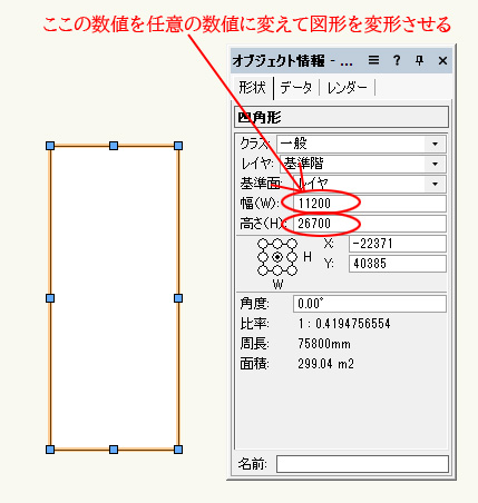 この変形方法は基本中の基本の図形の変形の方法です。変形したい図形をクリック、「オブジェクト情報パレット」内に選択図形の数値が出てきます、その数値をそのまま操作して変形をする事が可能です。