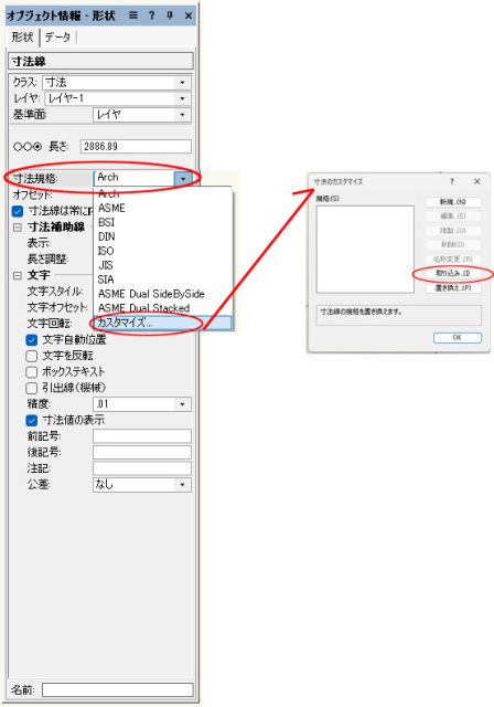 このように、注釈用の矢印や寸法・角度を記載する矢印は、自分仕様にカスタマイズができるため、自分仕様のマーカーを作成したら、フォーマットとして保存しておくと良いでしょう。フォーマット用のファイルを作り、そこからコピペで持ってくる方法や、寸法線の場合は、オブジェクト情報パレット内の「寸法企画」から「カスタマイズ」を選択し「取り込み(I)」からファイルを選択して、作成した寸法マーカーを選択すれば、取り込む事ができます。