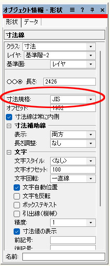 このような寸法線を書く方法を確認しましょう。寸法線を選択します、次に「オブジェクト情報パレット」内の「寸法規格」の中から「BSI」「DIN」「ISO」「JIS」等を選ぶと、マーカーが矢印の形の物に変わります。