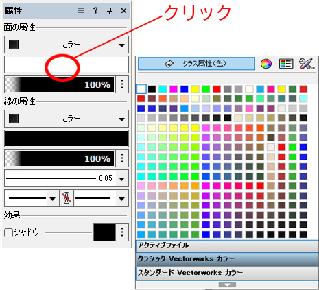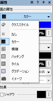 塗りつぶしをする際に、単色だけではなくいろいろな塗りつぶし方法があります。属性パレットのカラーのタブをクリックすると、塗りつぶしの方法が出てきます。