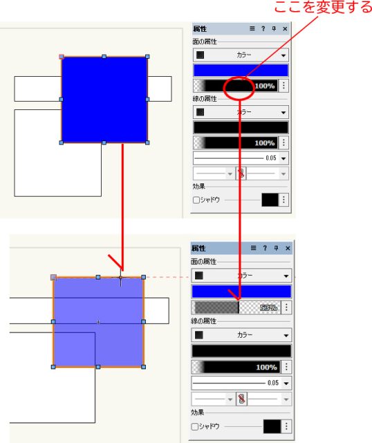 簡単に塗りつぶしの色の透明度を変える事ができます。