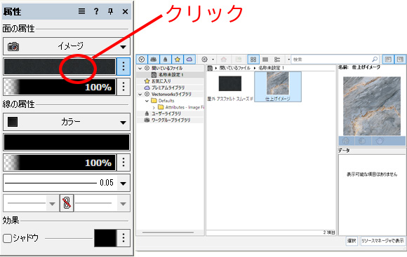 リソースマネージャー内に画像が取り込まれます。この画像を図面上で使用をしてみましょう。図形を選択し、属性パレット内のイメージから任意の画像をクリックすればOKです。