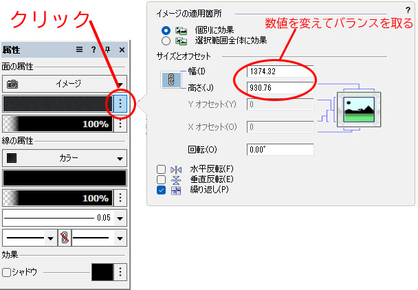 画像を塗りつぶした際に、縮尺やバランスが思っていた物と違う場合、縦横で張り付ける大きさを変える事ができます。設定の仕方は、属性パレット内のイメージ枠の下の四角い枠をクリック。