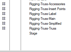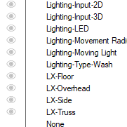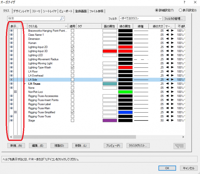 今回は、クラスごとの表示設定を変更し、照明関係をグレーアウト、吊り物関係を非表示、それ以外を表示にします。