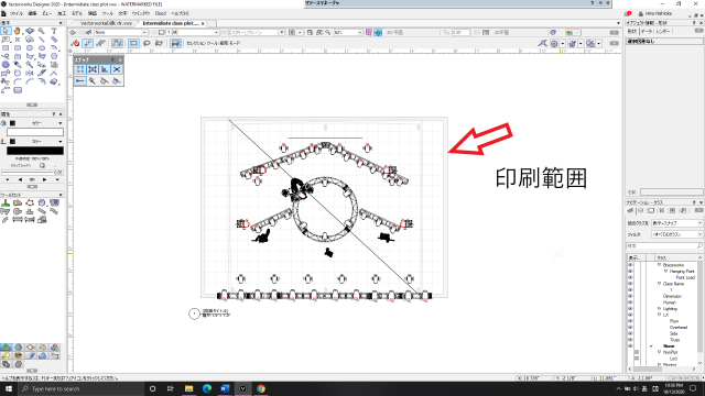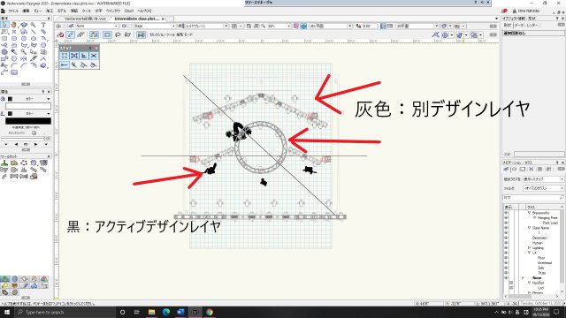 表示クラスはほぼ全てですが、吊り物や照明が灰色で表示されています。これらの図形は、他のデザインレイヤに存在するため、外面上では灰色での表示となっています。クラスは、別のレイヤー間で共有することもできます。ただし、ドラフト中には現在起動中のレイヤーに描かれている図形のみはっきりと表示され、他レイヤー内の同じクラスの図形などはグレーアウトされます。
