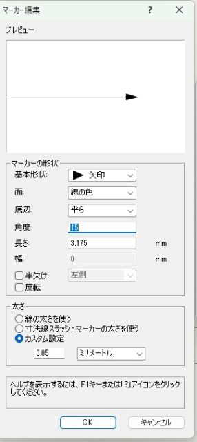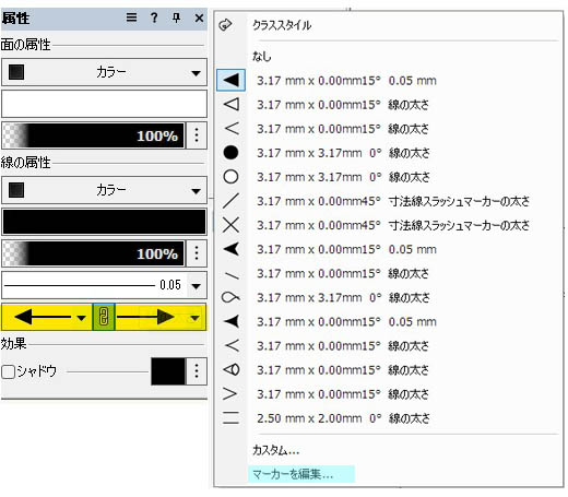 図面内に注釈を入れたり、勾配の表示等をする際に、線の始点や終点にマーカーを付けたい場合は視点マーカーを使い線の始点や終点に矢印や〇マーク等を付ける事ができます。こちらも属性内で設定ができます。