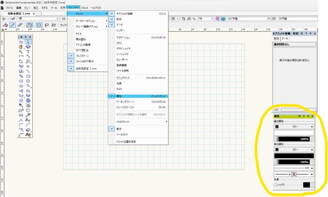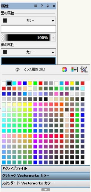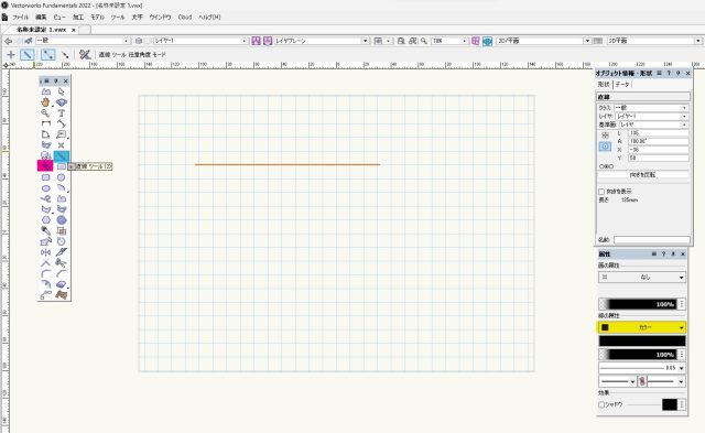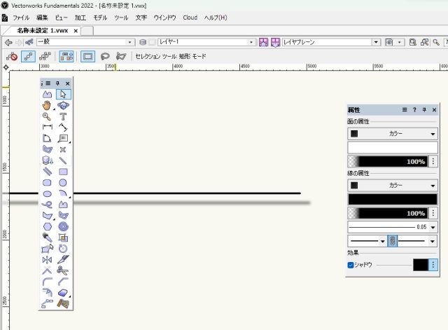 図面を書く上で一番多く使う線種はやはり実線です。まず線を書いてみましょう。ベクターワークスを開くと、右側に「属性パレット」が表示されます線種を編集する時はこちらのパレットから線種を選択していきます。