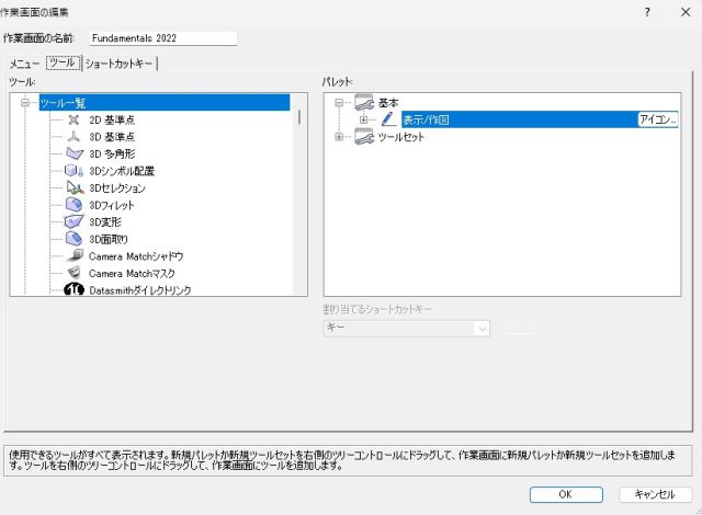 作業画面の編集内の「ツール」をクリックし「ツールの一覧」から目的のツールを選択し、右側の「パレット」の「基本」にドラッグして入れ込む事で、作図画面の基本ツールに表示がされます。