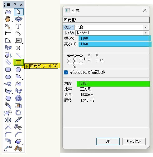 任意の寸法で四角形を作る時は、「四角形ツール」をダブルクリック、生成の編集ツールが表示されます。ここの「幅」と「高さ」の空欄部分に任意の数値を入力します。その下にある四角形のポイント表示は画面に戻った時のスナップの場所になります。任意のポイントにチェックを入れ「マウスクリックで位置決め」にチェックを入れ画面に戻るとポインターが表示されます。任意の場所でクリックをすれば、任意の寸法の四角形が作成できます。