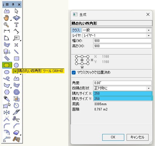 角を丸くした四角形も作成可能です。ボックス内の「隅の丸い四角形ツール」をクリック、後は四角形を作る時と同じ手順です。角丸のサイズを設定ができます。「隅丸サイズ」の部分に任意の数値を入力すればOKです。(1/4円なので任意の角丸の円の直径数値を入力)