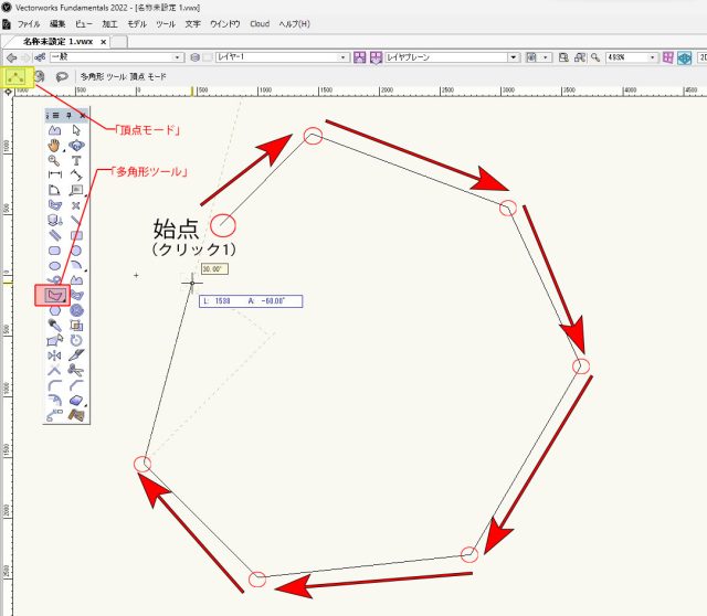 基本パレットから「多角形ツール」を選択→次にツールバーの「頂点モード」を選択します。後は、頂点となる部分をクリックしていくと多角形が生成されます。最後に始点部分に持ってくると、端点スナップがかかり図形が閉じた状態となり多角形が完成します。