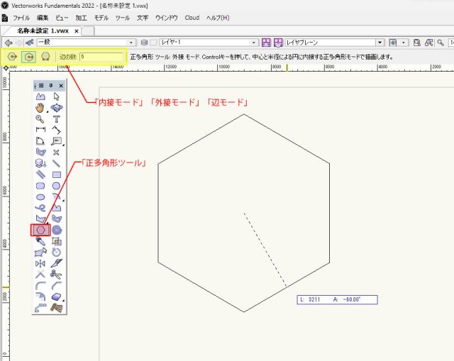 正多角形や円を作るのも簡単です。「正多角形ツール」を使い辺の数を入力、後はクリック&ドラックで多角形を形成できます。ツールバーの「内接モード」「外接モード」「辺モード」を使う事でどこを始点として形成するかが選択できます。