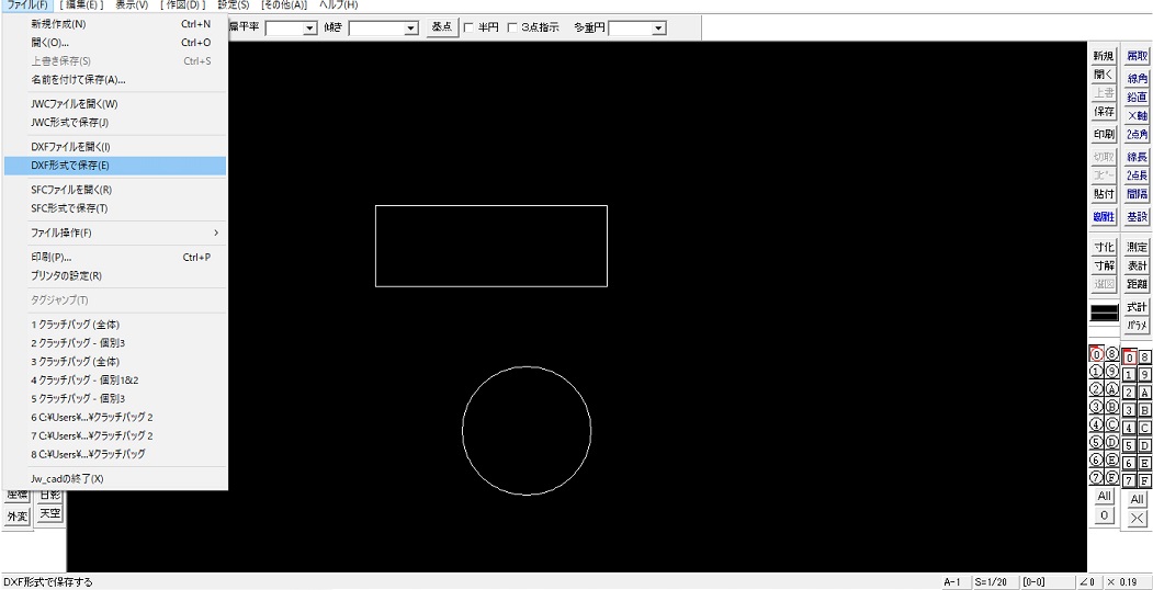ファイルから実際に作成したデータを保存しましょう。保存する際はcadデータの形式を選択して保存します。下記では「.dxf」形式で保存しています。