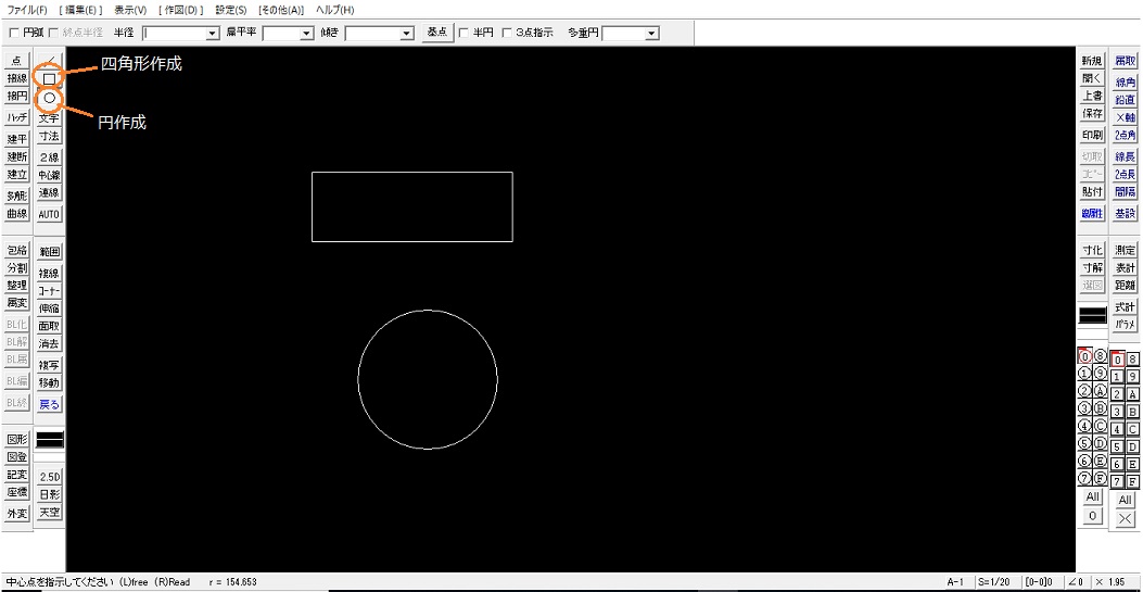 こんな感じで線がひけます。四角形や円形も簡単に作れるコマンドも便利です。