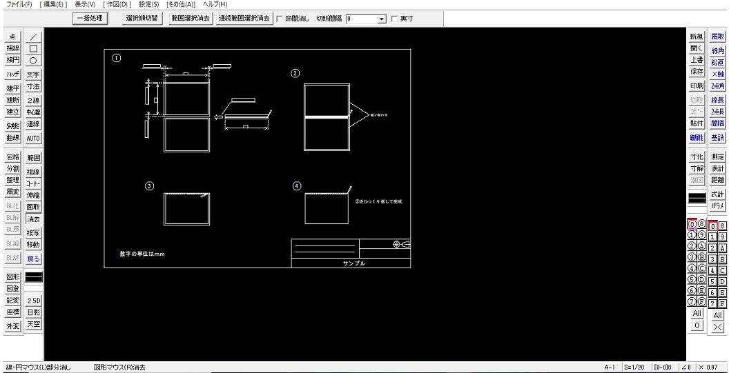 | 特徴 | Jw-CADは、フリーの汎用CADソフトです。 2Dとしてのみの機能であるため、高機能CADと比べて単純で分かりやすい概念のCADです。建築用CADとして扱うことが多く、手書きに近い感覚で書くことができます。 |