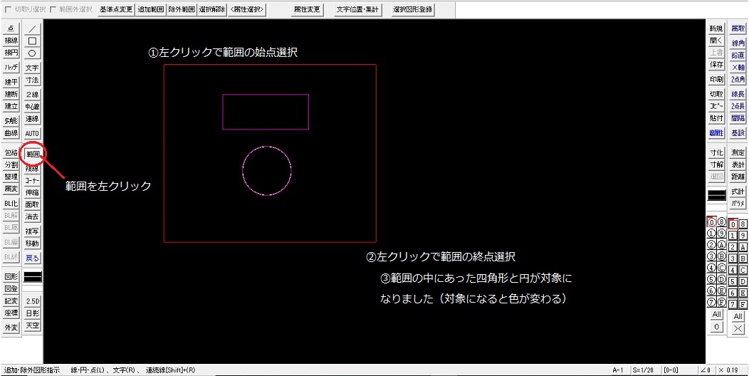 今度は実際に描いてみた四角形や円などの図形を移動させてみましょう。まずは実際に移動させたい対象を範囲指定します。